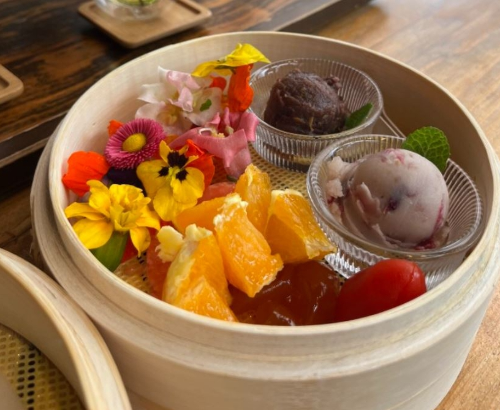 여러가지 색의 얇은 떡전에 꽃,양갱등으로 쌈을 싸먹는건데