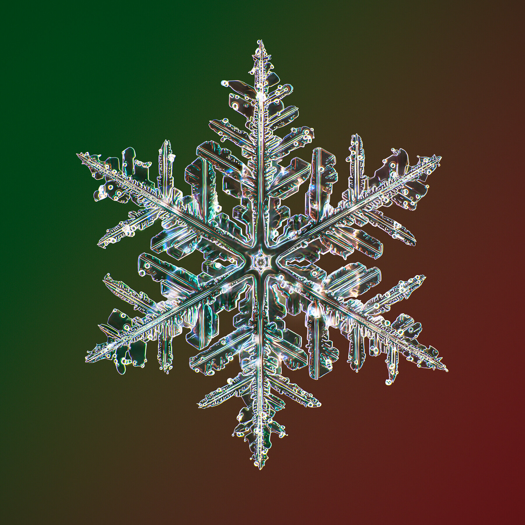 별 모양의 눈 결정은 작은 육각형 판에서 시작하여, 결정이 커지면서 6개의 모서리에서 잔가지가 나오는 형태로 발전합니다.