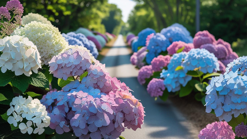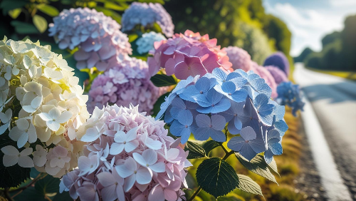 - 특징: 수국이 차량이 지나가는 도로와 나란히 피어 눈길 사로잡음.