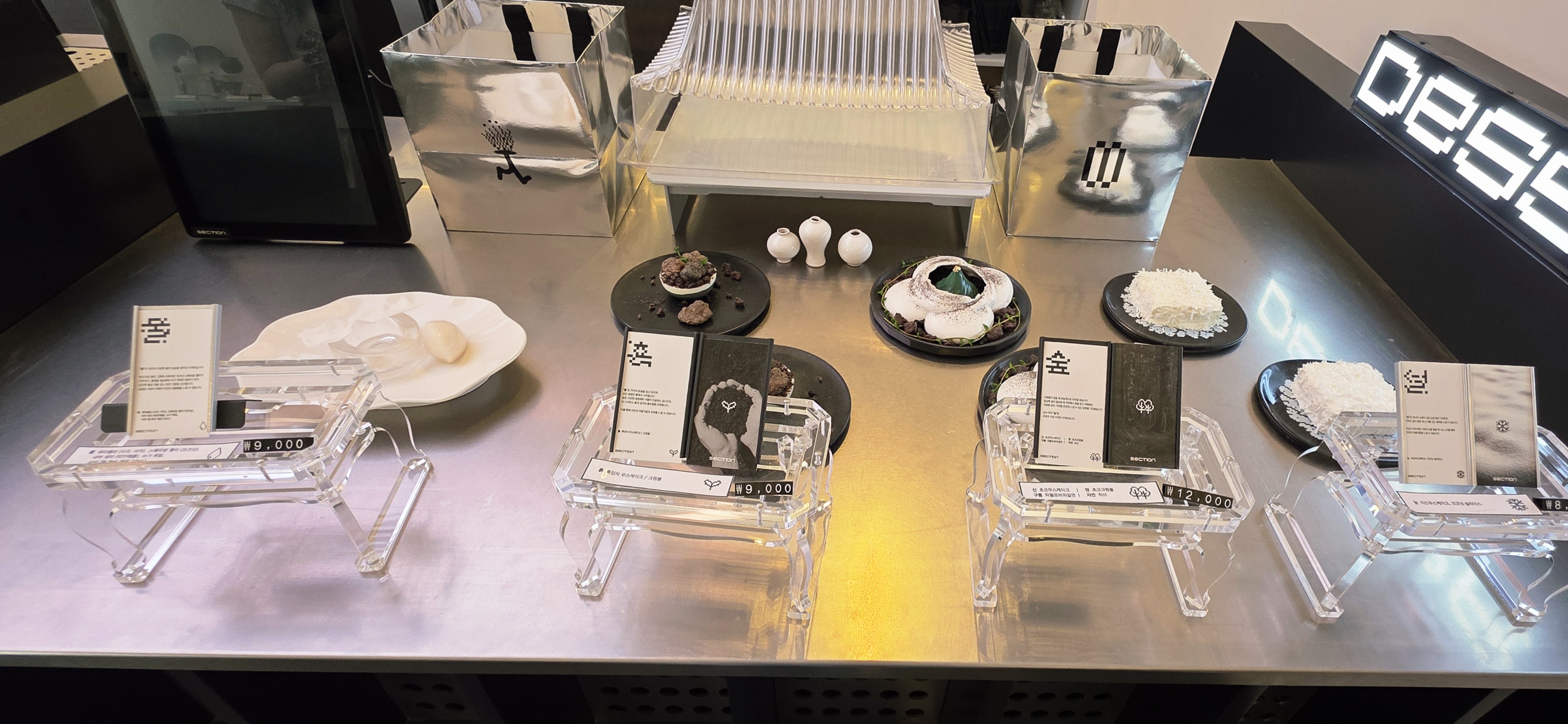 아무리 공간이 멋져도 카페의 본질은 커피와 디저트 아니겠어요? 카페 섹션은 비주얼뿐 아니라 맛까지 훌륭했습니다. 특히 이곳의 시그니처 디저트들은 **'숲', '물', '흙', '설(雪)'**이라는 이름처럼 자연에서 영감을 얻은 아름다운 비주얼과 섬세한 맛을 자랑합니다.