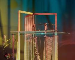 - 작품 내용: 움직이는 빛을 이용하여 공간을 조각하고 변화시키는 키네틱 아트 작품입니다. 금속, 유리, 플라스틱 등의 재료로 만들어진 구조물에 빛을 비추어 다양한 그림자와 빛의 반사를 만들어내며, 전동 장치로 움직여 시각적인 역동성을 더합니다.: